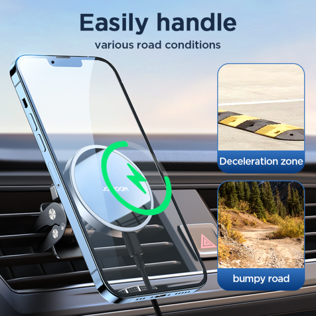 Gérer facilement diverses conditions de routeJoyroom 15W Qi support de téléphone de voiture chargeur sans filAttraction magnétique Super forteJoyroom 15W Qi support de téléphone de voiture chargeur sans filOpération à une main