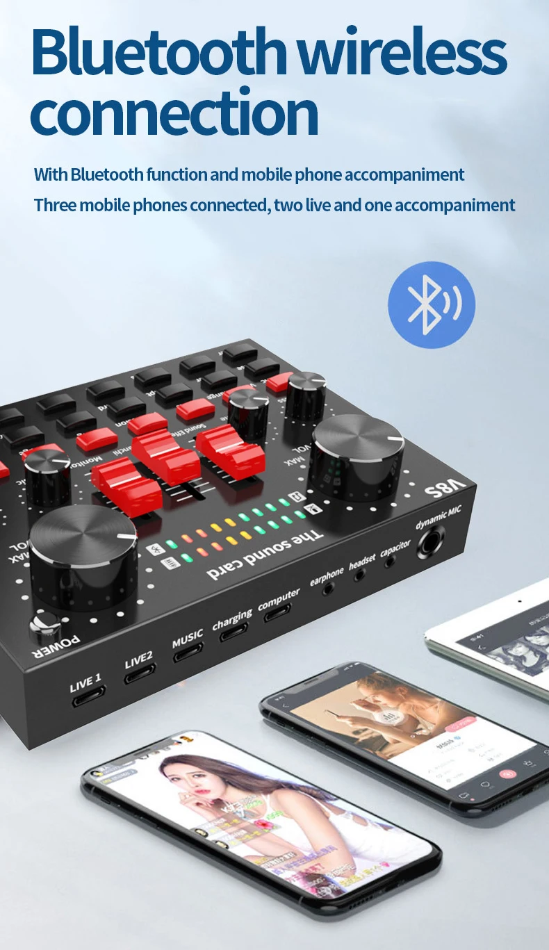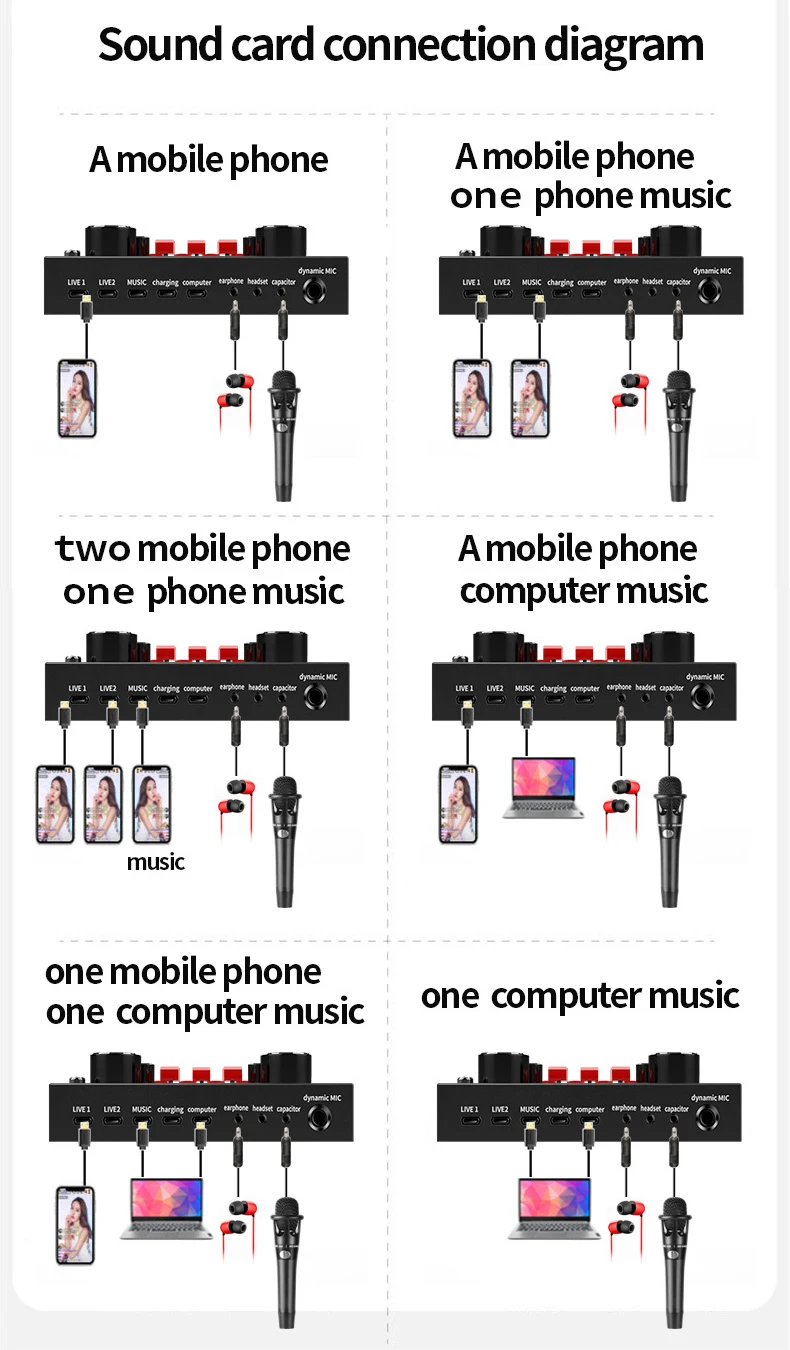 7.6 types de méthodes de connexion: un téléphone mobile K chanson en direct, double téléphone mobile en direct, trois téléphones mobiles en direct, téléphone mobile synchrone avec ordinateur en direct, un ordinateur en direct, guidage par ordinateur téléphone mobile en direct.